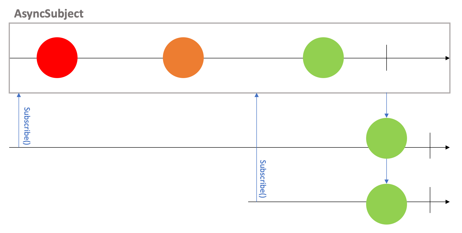 - AsyncSubject : Observer가 언제 구독을 했던지, onComplete 직전 마지막 데이터를 동시에 받습니다.