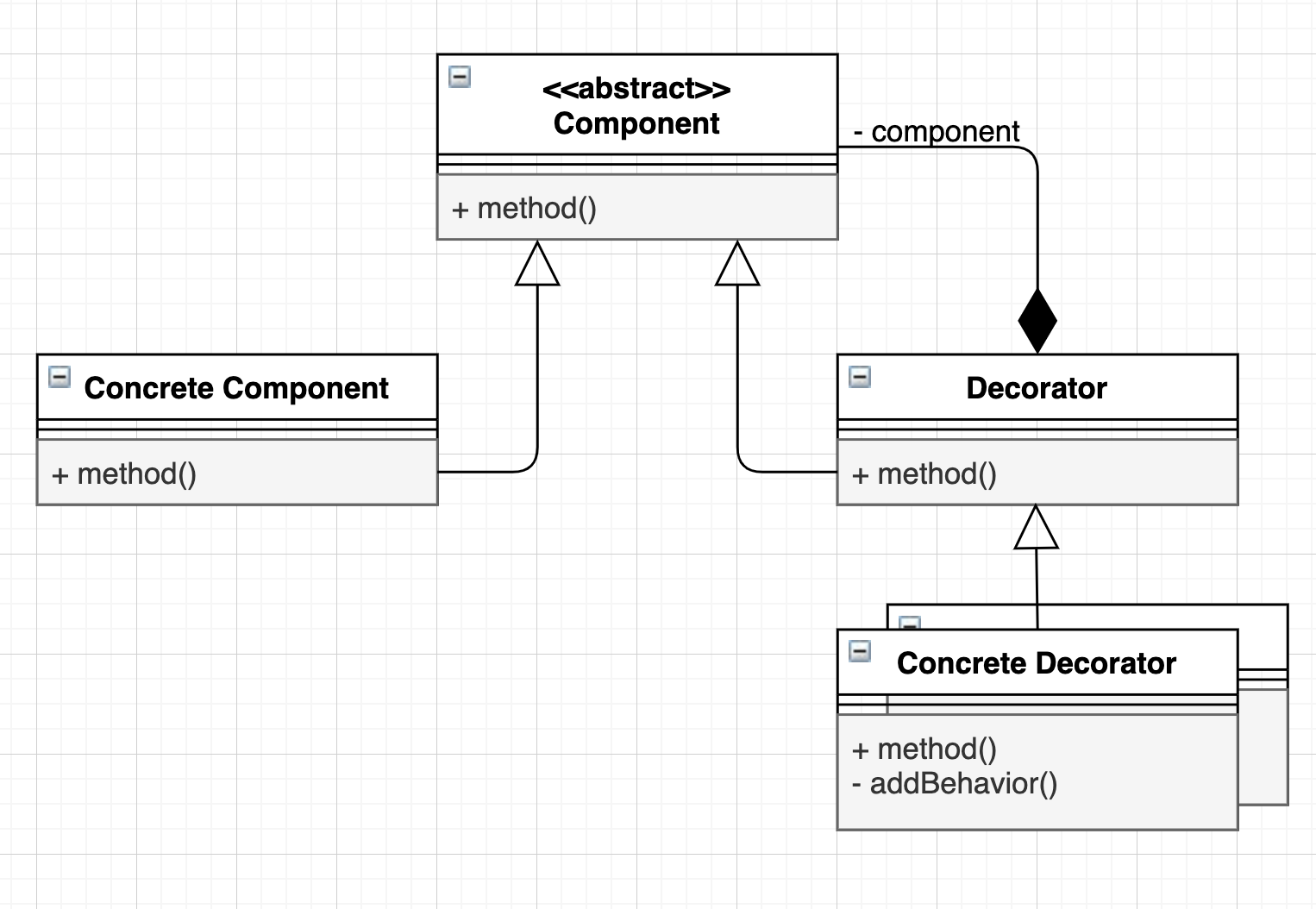 이때 주목할 점은 Decorator 클래스가 Component 로 컴포지션 관계를 갖는다는 것이다.